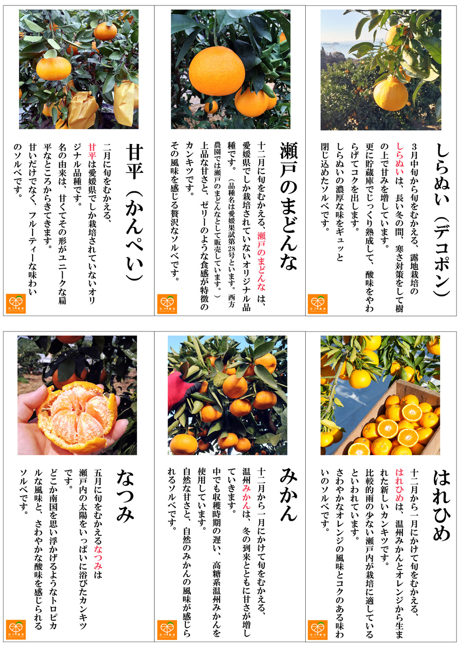 うんしゅうみかん、なつみ、瀬戸のまどんな、はれひめ、甘平、しらぬいの6品種のアイスを販売中です。