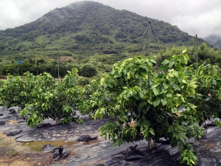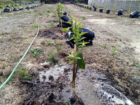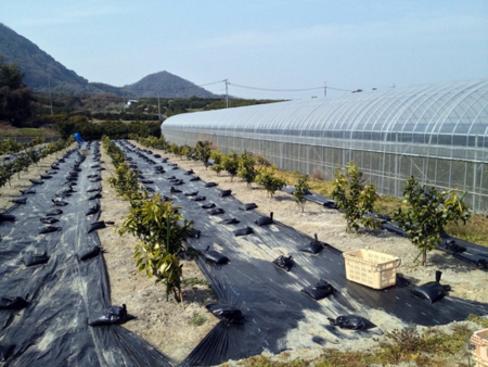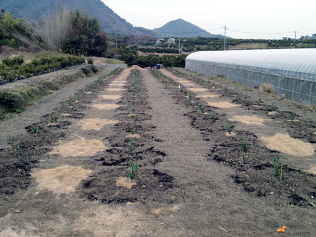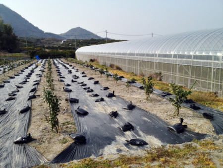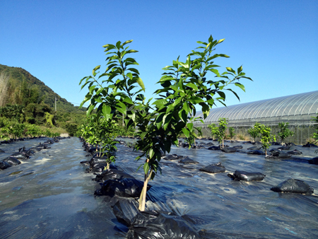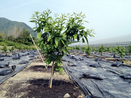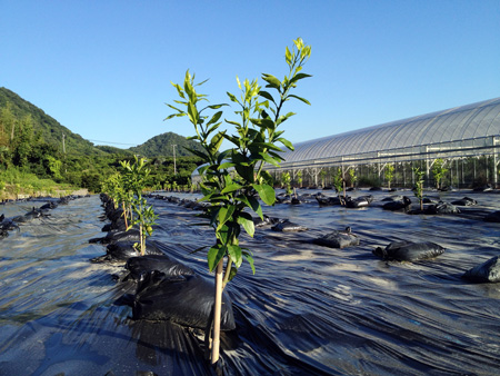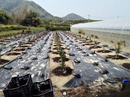 今年から本格的な収穫にあたり、この苗木の園地では白いマルチを敷いています。
