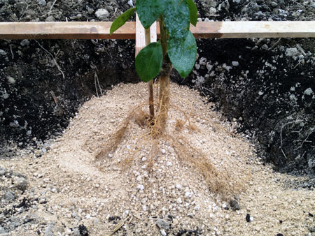 根を傷つけないように慎重に植えていきます。まわりの土は真砂土です。
