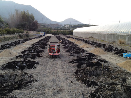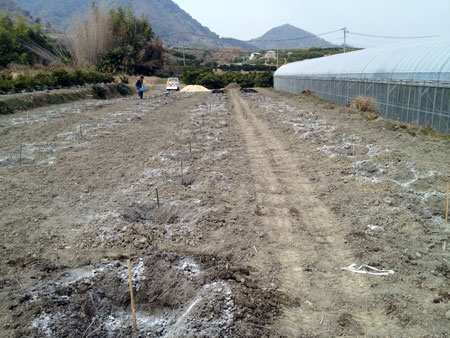 穴を掘って、そしてポイントに石灰を撒いて、堆肥や油粕を混ぜます。