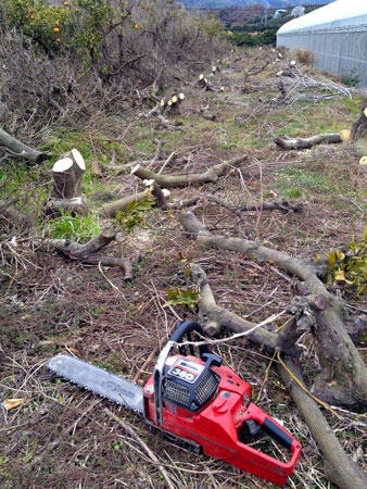 次にチェーンソウで老木を伐採していきます。この園地は「いよかん」「はっさく」「温州みかん」が混在していてなかでも「はっさく」の樹は手ごわかった。。。