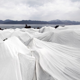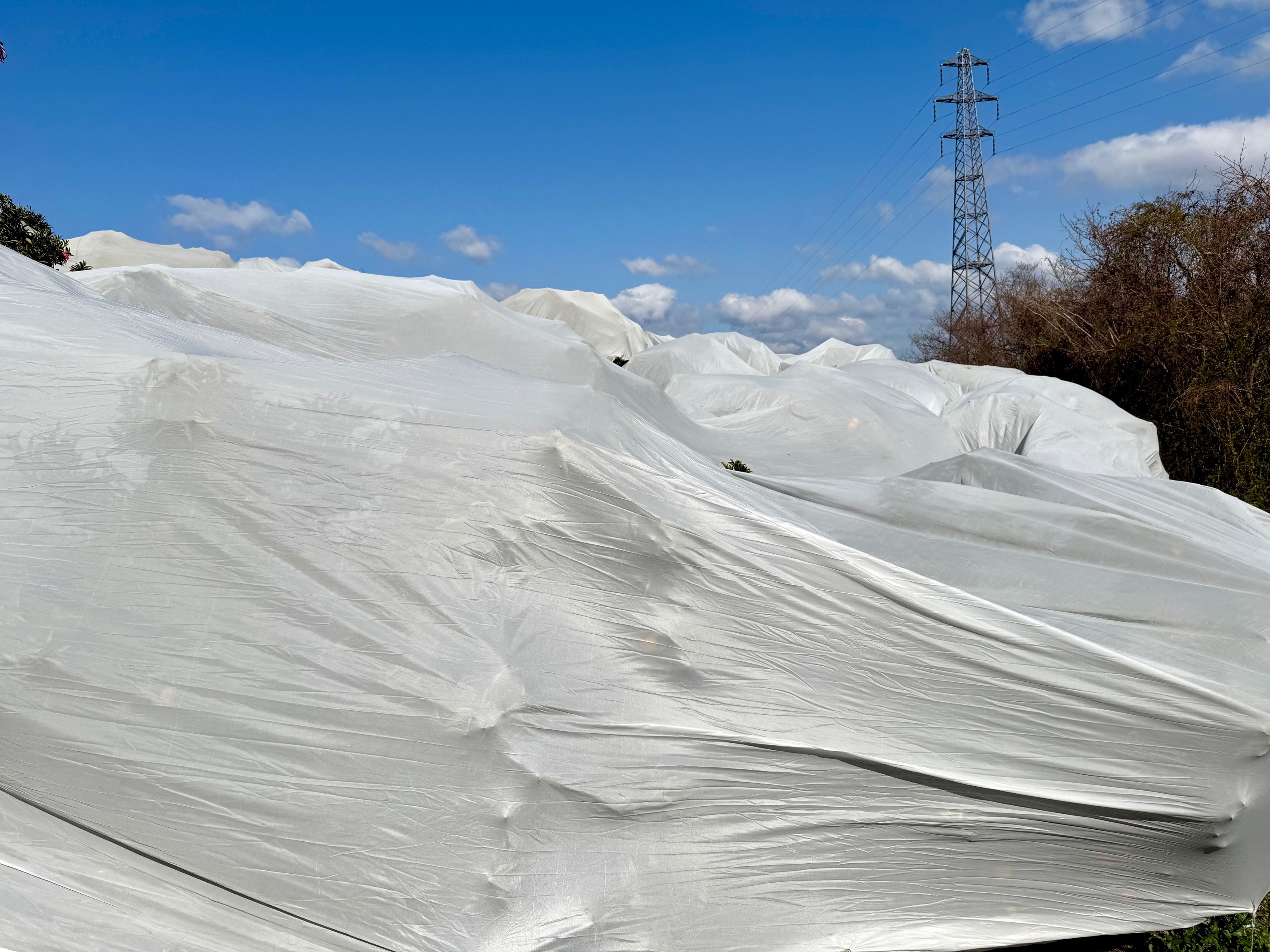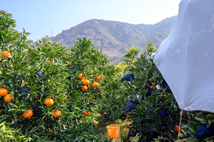 寒い冬の間、せとか園では樹を白い布で覆って、寒さ対策をして越冬完熟させます。